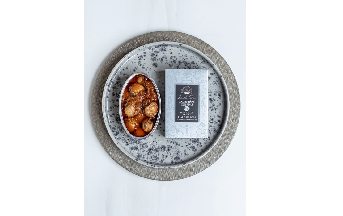 Producto de campaña Mejillones de Galicia procedentes de los fondos arenosos de la ría de O Grove, Almejas blancas de la Ría de Chica al natural con su líquido de gobierno y empacadas a mano una a una de forma manual, Zamburiñas procedentes de la pesca artesanal de las zonas gallegas de Rianxo y Cambados, acompañadas de un guiso natural y tradicional exquisito, Navajas procedentes de la costa gallega, su método de captura es mediante técnicas de buceo por apnea, ordenadas por tamaños y empacadas manualmente