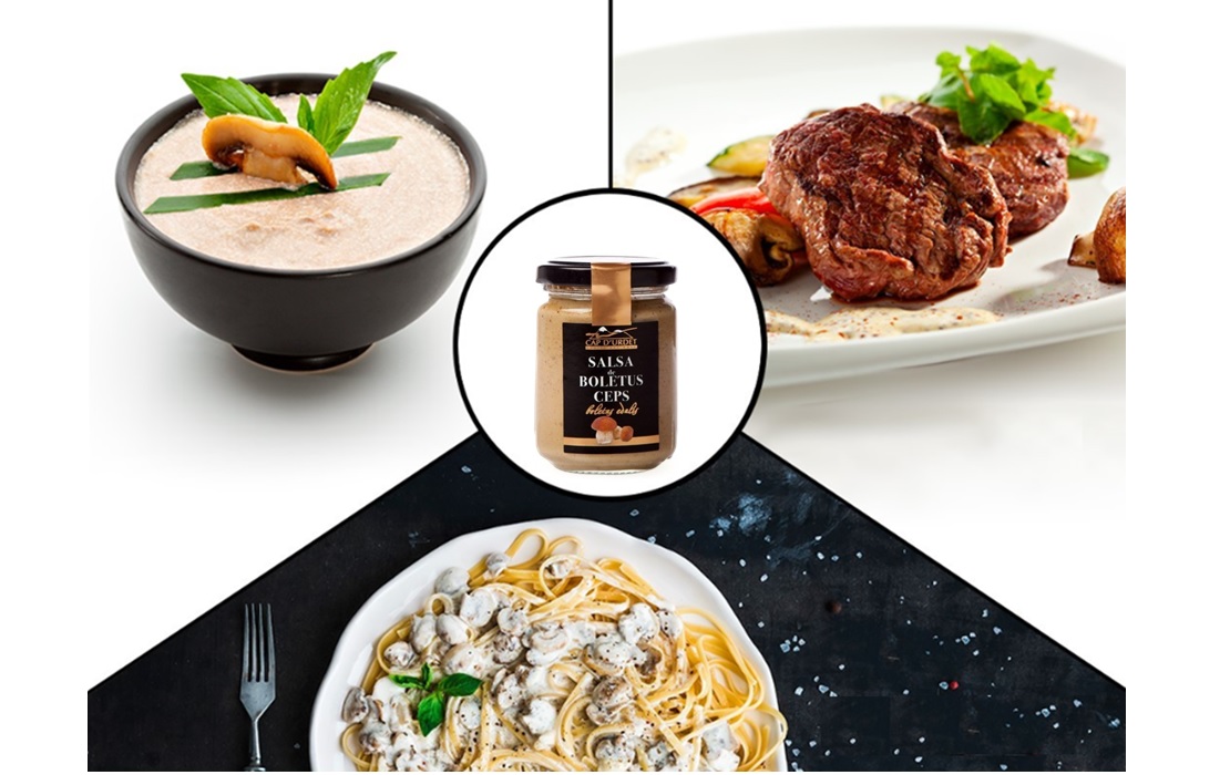 Salsa de boletus: Esta salsa es un concentrado elaborado principalmente con cepas (boletus edulis) y nata. Lista para servir. Nos permite disfrutar de una forma fácil y rápida del sabor característico de esta seta silvestre. Ideal para combinar con pastas, arroces, carnes o como aperitivo en canapés y tostadas.